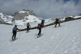 Después de esquiar hasta abajo toda la canal nos toca remontar un rato hasta el ultimo hilo de nieve que, a estas alturas del año, todavía llega prácticamente hasta la estación superior del teleférico, lugar donde pondremos punto final a otro buen fin de semana de esquí de travesía en Picos.